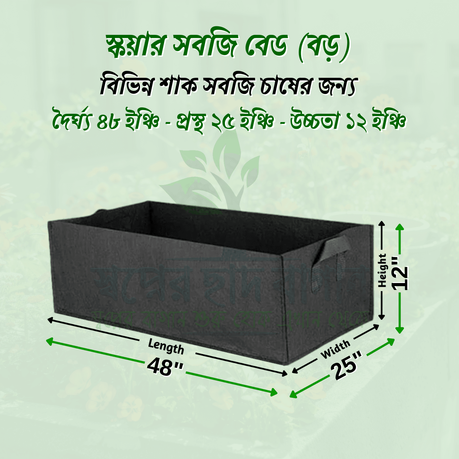 • সাইজ: স্কয়ার সবজি বেড (দৈর্ঘ্য: ৪৮ ইঞ্চি, প্রস্থ: ২৫ ইঞ্চি, উচ্চতা: ১২ ইঞ্চি)